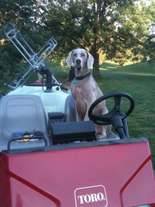Beautiful Weimaraner ready for work with his pet parent.